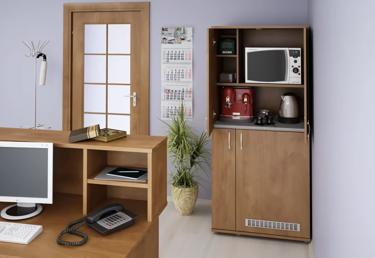В кухне предусмотрены лотки и полки для хранения столовых приборов, ниши для размещения печи СВЧ и холодильника, сушка для посуды (поддон в комплекте). Кухня укомплектована пластмассовыми проводниками для прохождения необходимых при использовании бытовой техники проводов. Для естественной вентиляции холодильника в мини-кухне предусмотрена вентилируемая задняя стенка, на распашных фасадах вмонтирована вентиляционная решетка.
