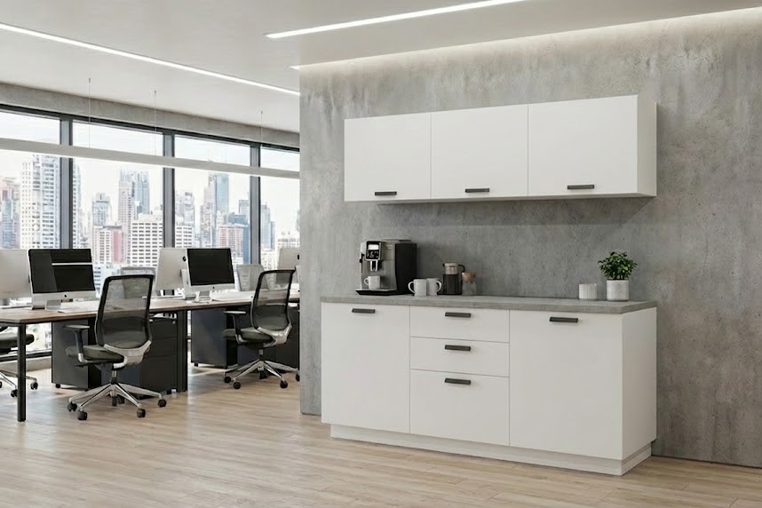 Мини-кухня гармонично впишется в столовые зоны офиса, а также зоны отдыха, обеспечивая сотрудникам удобство и соблюдение гигиенических норм. Кухня идеально подходит для помещений, где не предусмотрена полноразмерная кухня.