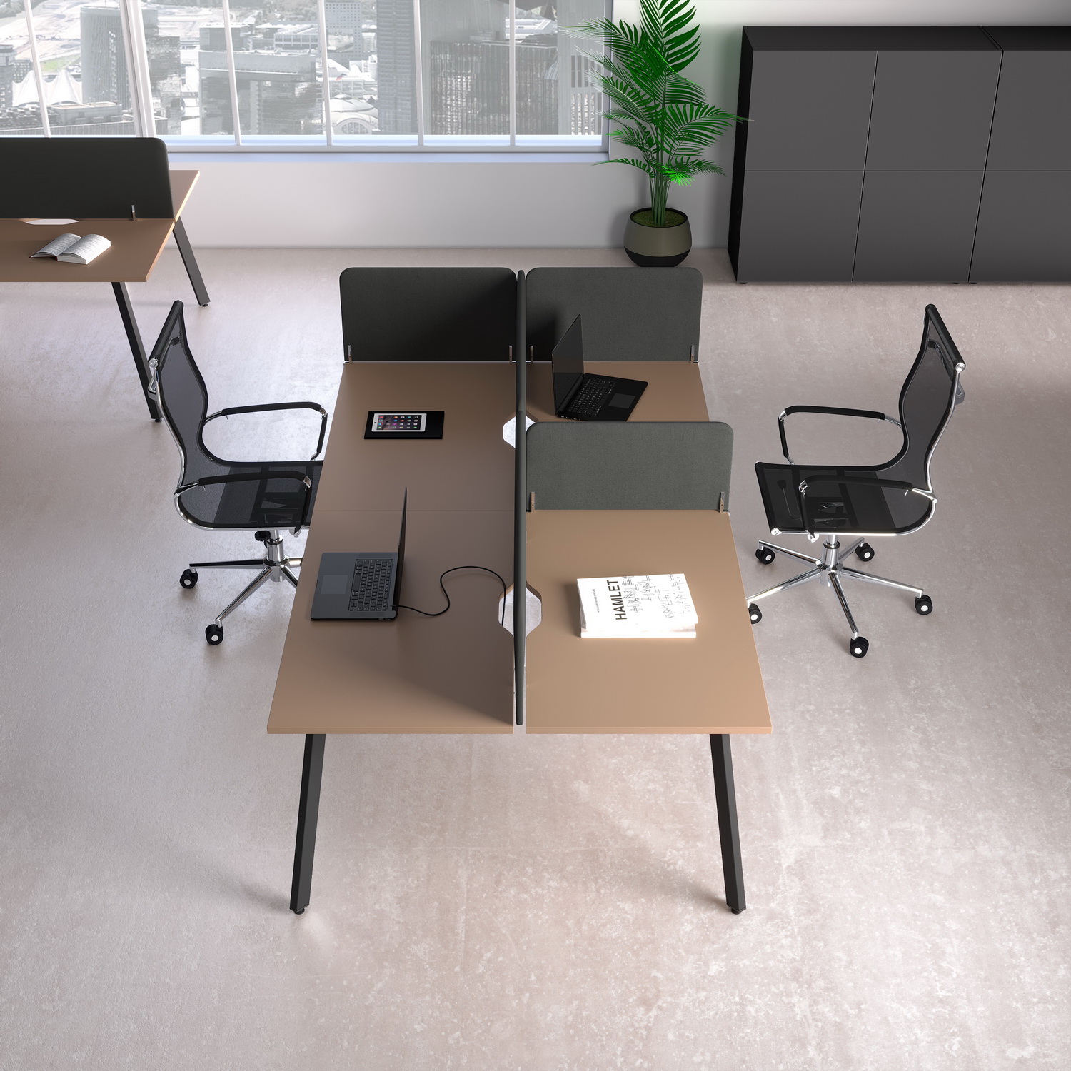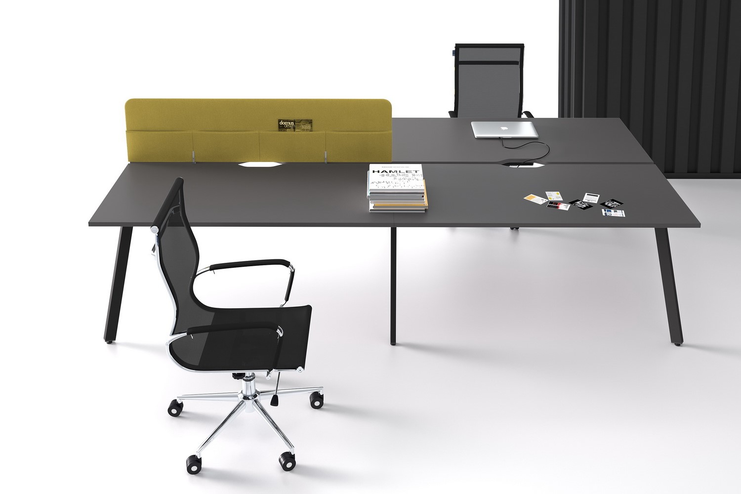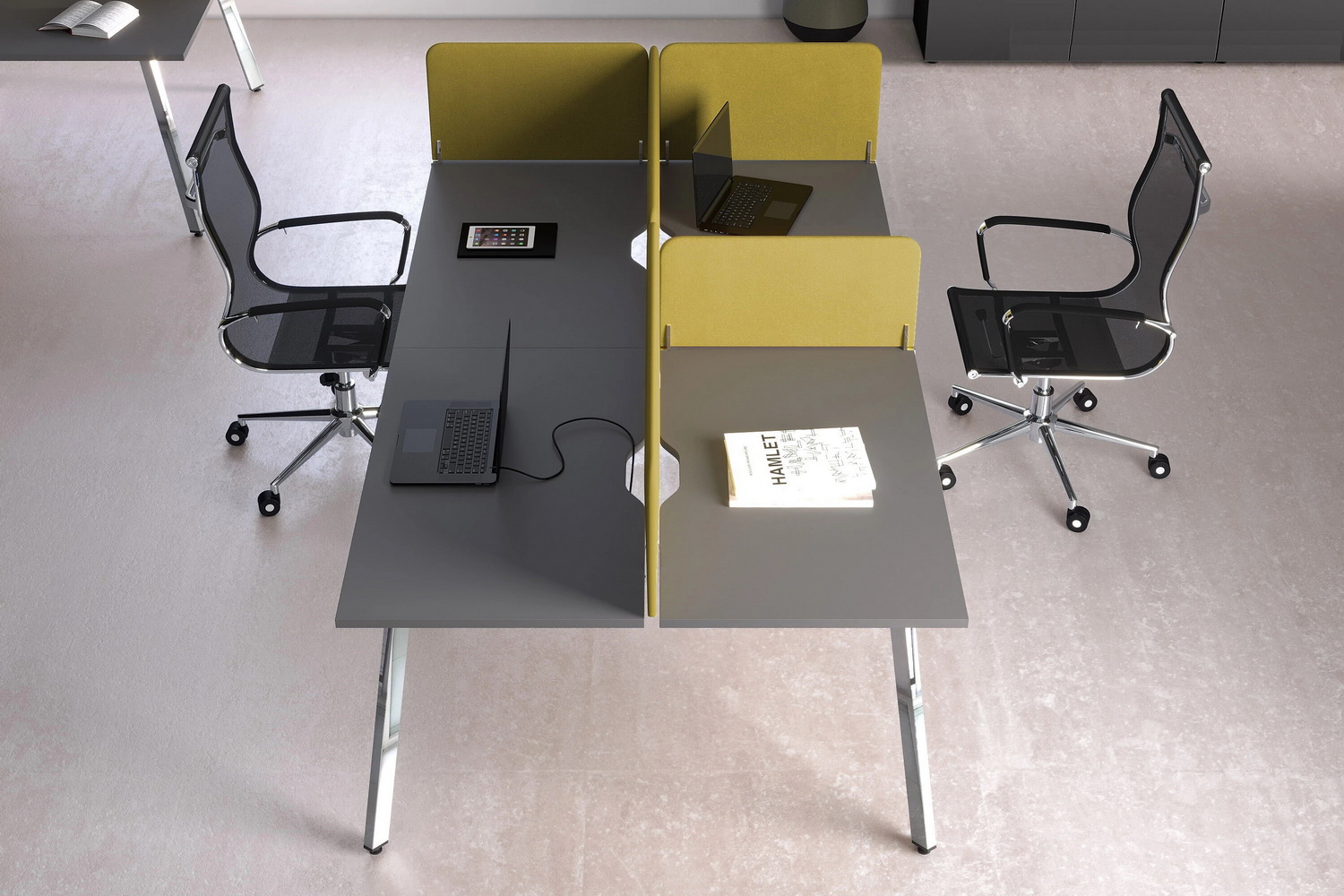 - Металлокаркас (опоры столов): Подстолье с прямоугольной ножкой, 60х30мм, уникальная геометрия опоры (3D-эффект).