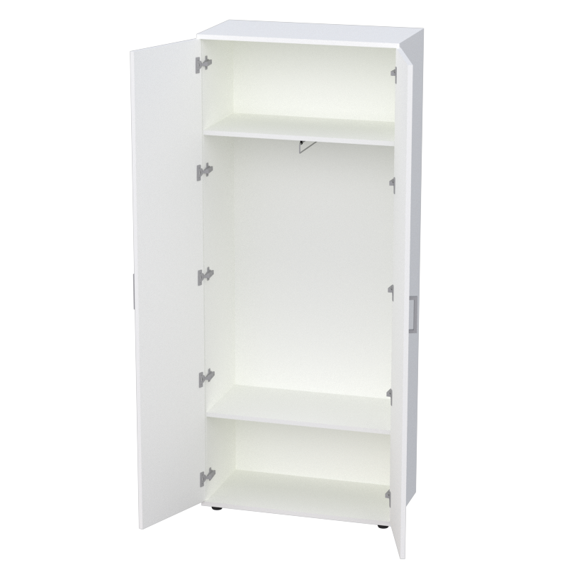 Гардероб с деревянными дверцами станет практичным решением для организации хранения в офисе. Внутреннее пространство оборудовано верхней и нижней полками, а также рейлом для вешалок — всё необходимое для размещения верхней одежды, униформы и личных вещей сотрудников.