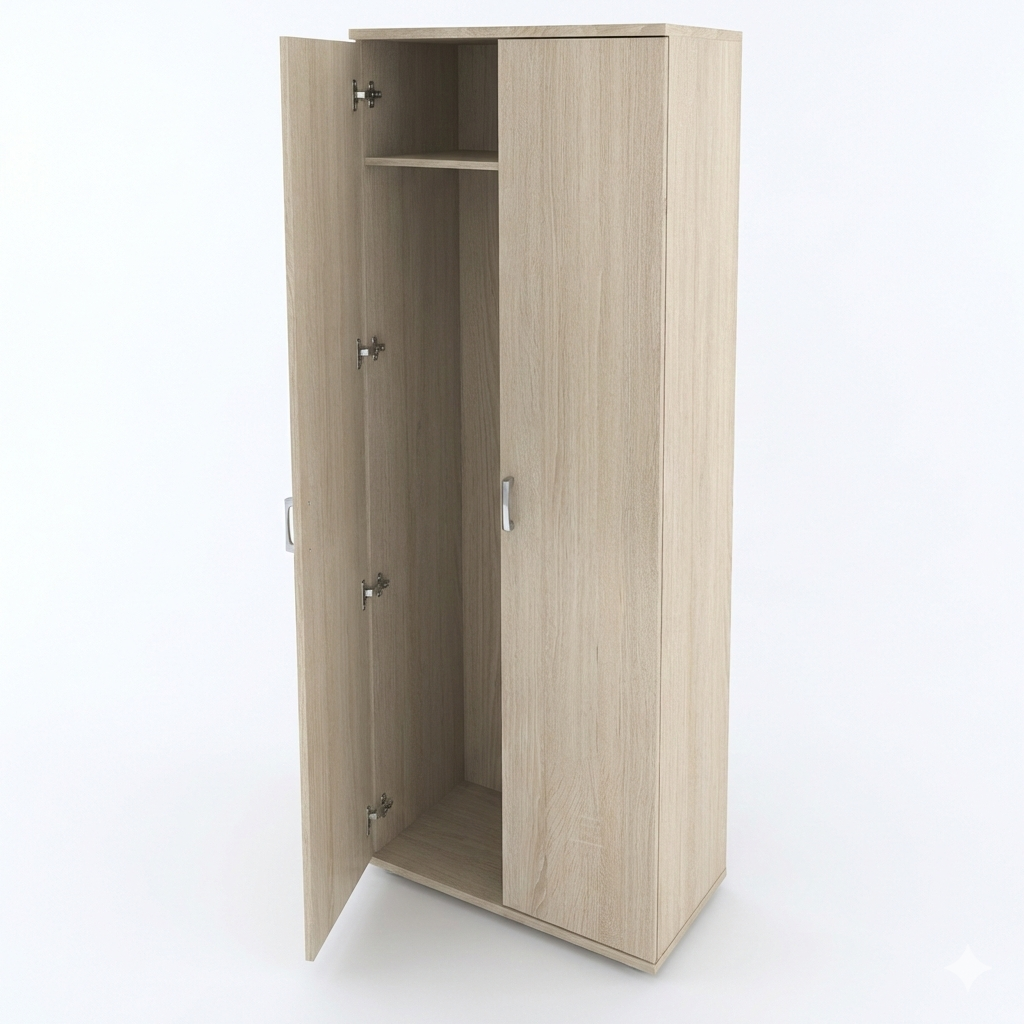 Недорогой вариант шкафа для одежды с полкой и выдвижной штангой. Изготовлен гардероб из ЛДСП 16 мм., кромка ПВХ 1/0,5 мм. Опоры пластиковые, регулируемые. Задняя стенка - ТСН толщиной 3,2 мм в цвет корпуса. Ручки - пластик, цвет "Алюминий".