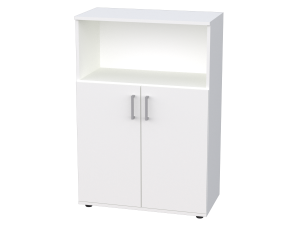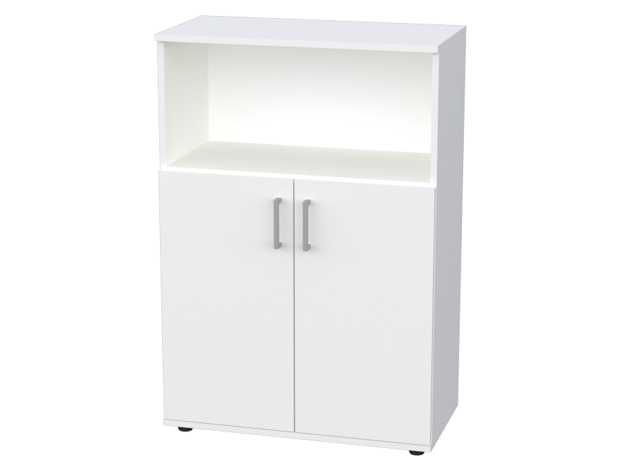 Конструкция демонстрирует все преимущества коллекции Монисто: прочный металлический каркас, фасады из ДСП 18 мм с декоративными панелями и аккуратную кромку ПВХ 1 мм. Глухие малые дверцы обеспечивают защиту содержимого от пыли и поддерживают чистый визуальный облик, а на открытой полке удобно размещать документы, декор, награды.