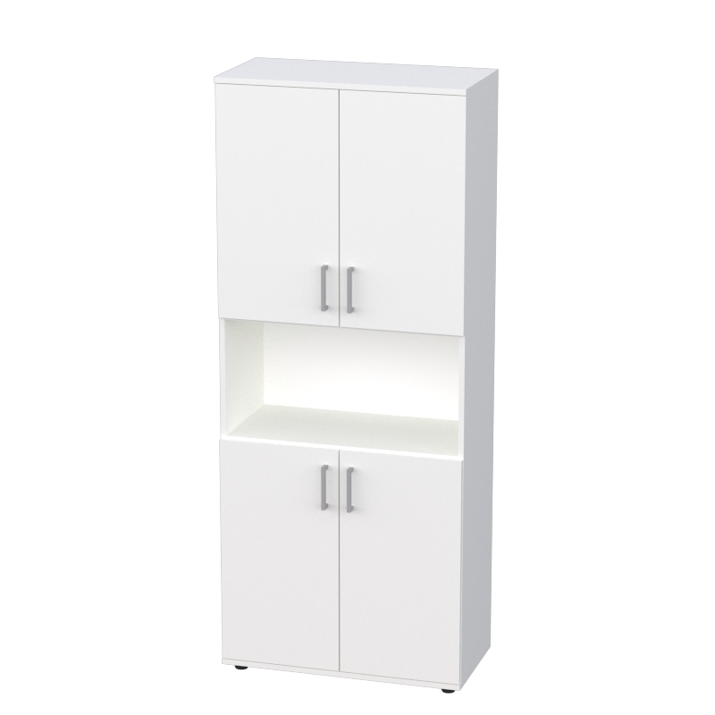 Шкаф с двумя отделениями и открытой полкой посередине предлагает универсальное решение для офисного хранения. Верхние и нижние дверцы из ДСП скрывают содержимое, а центральная открытая полка обеспечивает быстрый доступ к часто используемым предметам.