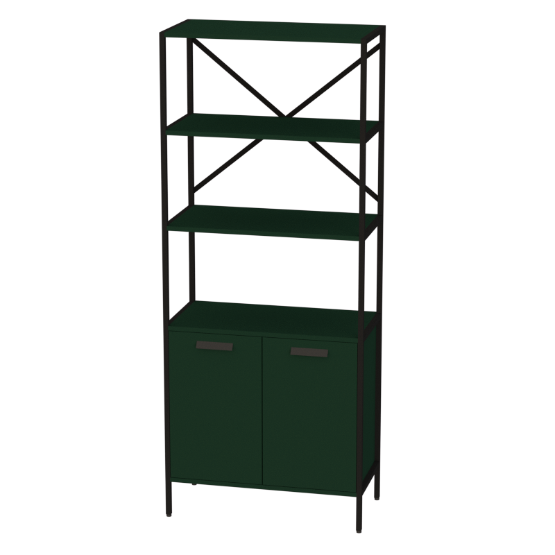 Высокий стеллаж с металлическим каркасом и дополнительными крестообразными креплениями по задней стенке создает надежную систему хранения для офиса. В нижней части расположен закрытый шкафчик с деревянными дверцами для защиты содержимого, а вверху — три открытые полки для легкого доступа к документам и материалам.
