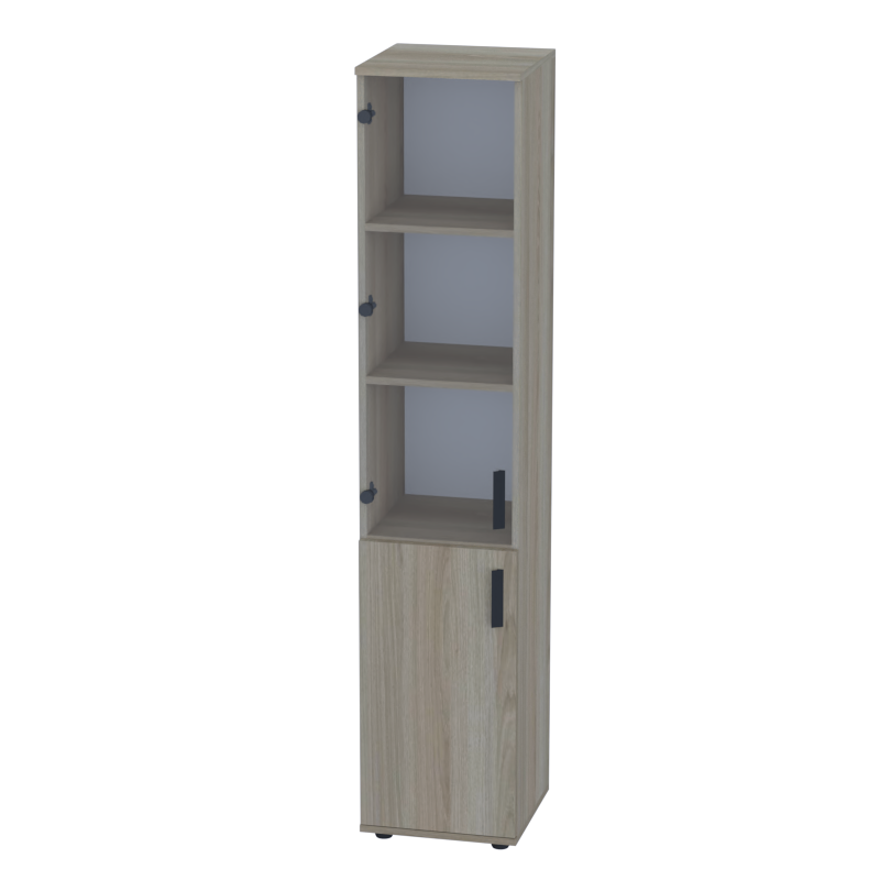 Высокий комбинированный пенал с глухой дверцей из ДСП в нижней части и стеклянной дверцей в верхней сочетает практичность хранения с современной эстетикой. Нижняя секция надежно скрывает содержимое, а верхняя прозрачная часть обеспечивает визуальный доступ к часто используемым материалам или демонстрационным образцам.
