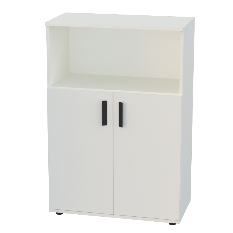 Конструкция демонстрирует все преимущества коллекции Монисто: прочный металлический каркас, фасады из ДСП 18 мм с декоративными панелями и аккуратную кромку ПВХ 1 мм. Глухие малые дверцы обеспечивают защиту содержимого от пыли и поддерживают чистый визуальный облик, а на открытой полке удобно размещать документы, декор, награды.