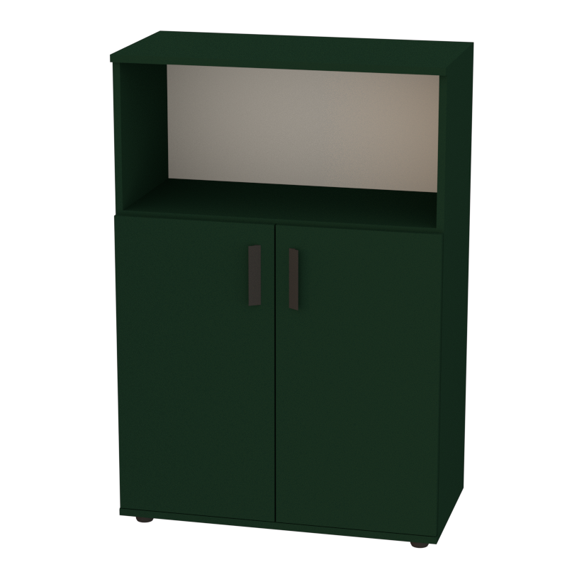 Конструкция демонстрирует все преимущества коллекции Монисто: прочный металлический каркас, фасады из ДСП 18 мм с декоративными панелями и аккуратную кромку ПВХ 1 мм. Глухие малые дверцы обеспечивают защиту содержимого от пыли и поддерживают чистый визуальный облик, а на открытой полке удобно размещать документы, декор, награды.