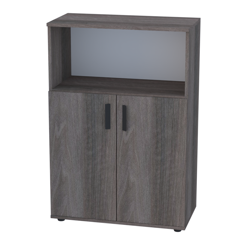 Конструкция демонстрирует все преимущества коллекции Монисто: прочный металлический каркас, фасады из ДСП 18 мм с декоративными панелями и аккуратную кромку ПВХ 1 мм. Глухие малые дверцы обеспечивают защиту содержимого от пыли и поддерживают чистый визуальный облик, а на открытой полке удобно размещать документы, декор, награды.