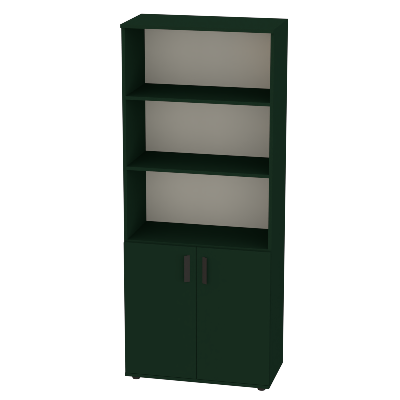 Шкаф с закрытой нижней частью и открытыми полками вверху предлагает сбалансированное решение для офисного хранения. Закрытая секция надежно скрывает документы и материалы, в то время как открытые полки обеспечивают быстрый доступ к часто используемым материалам и образцам.