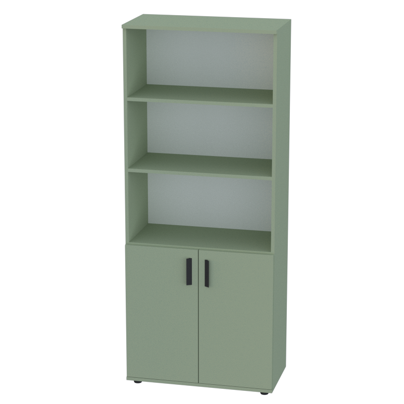 Шкаф с закрытой нижней частью и открытыми полками вверху предлагает сбалансированное решение для офисного хранения. Закрытая секция надежно скрывает документы и материалы, в то время как открытые полки обеспечивают быстрый доступ к часто используемым материалам и образцам.