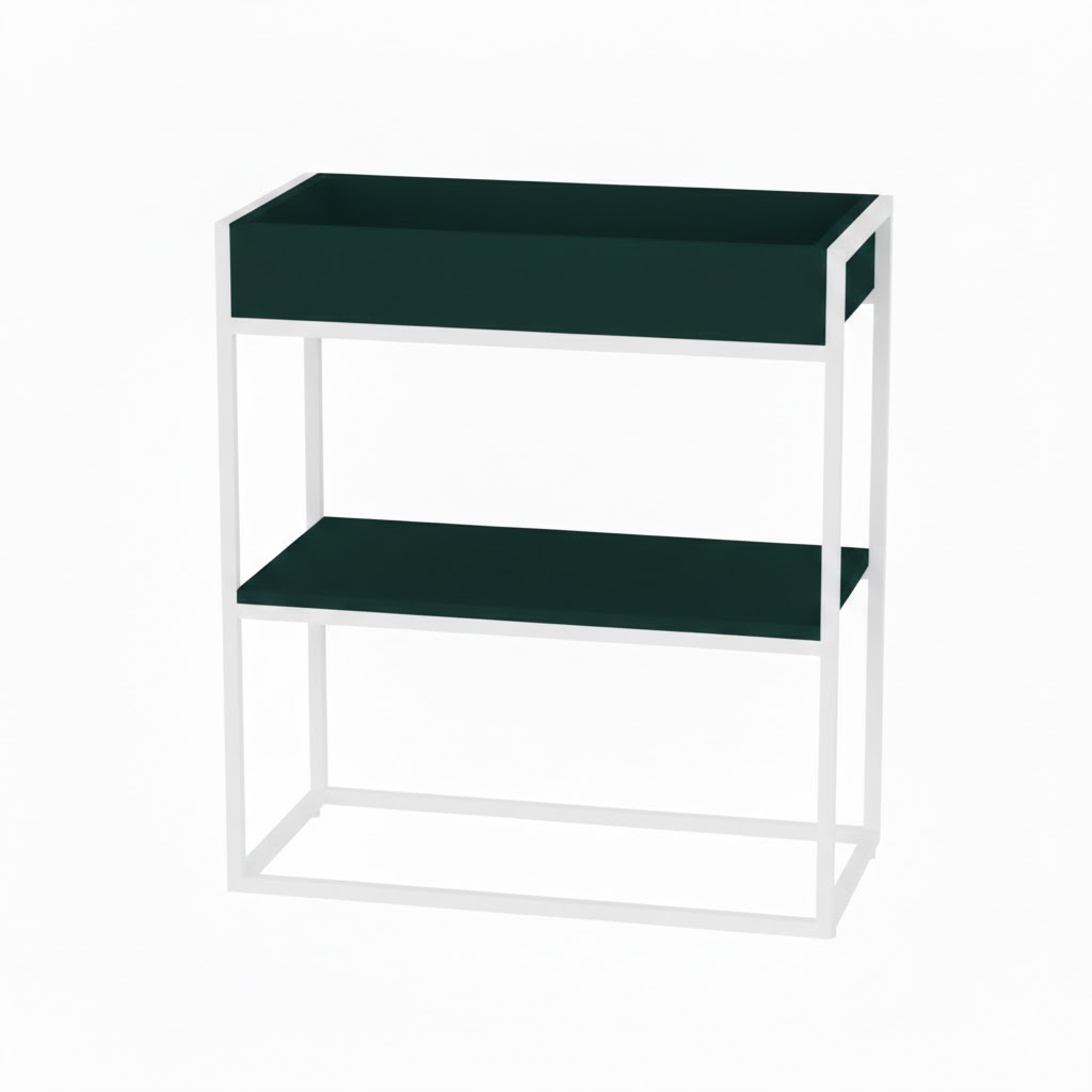 Металлический каркас обеспечивает прочность и устойчивость конструкции. Полки и кашпо выполнены из ЛДСП, что гарантирует единство стиля и долговечность. Растения в верхней части не только украшают интерьер, но и способствуют созданию комфортной рабочей атмосферы.