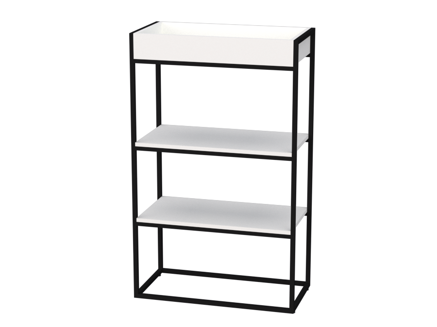 Высокий стеллаж-кашпо сочетает функциональность хранения с элементами озеленения офисного пространства. В нижней части расположены две обычные полки для документов или рабочих материалов, а вверху — встроенный ящик-кашпо для живых растений.