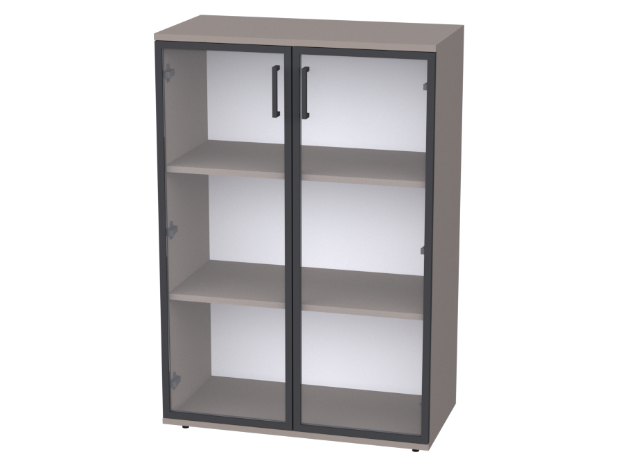 Каркас из металлического профиля обеспечивает устойчивость конструкции. Стеклянные двери в тонкой металлической раме защищают содержимое от пыли, сохраняя обзорность. Полки из ДСП 18 мм с аккуратной кромкой ПВХ 1 мм выдерживают значительную нагрузку.