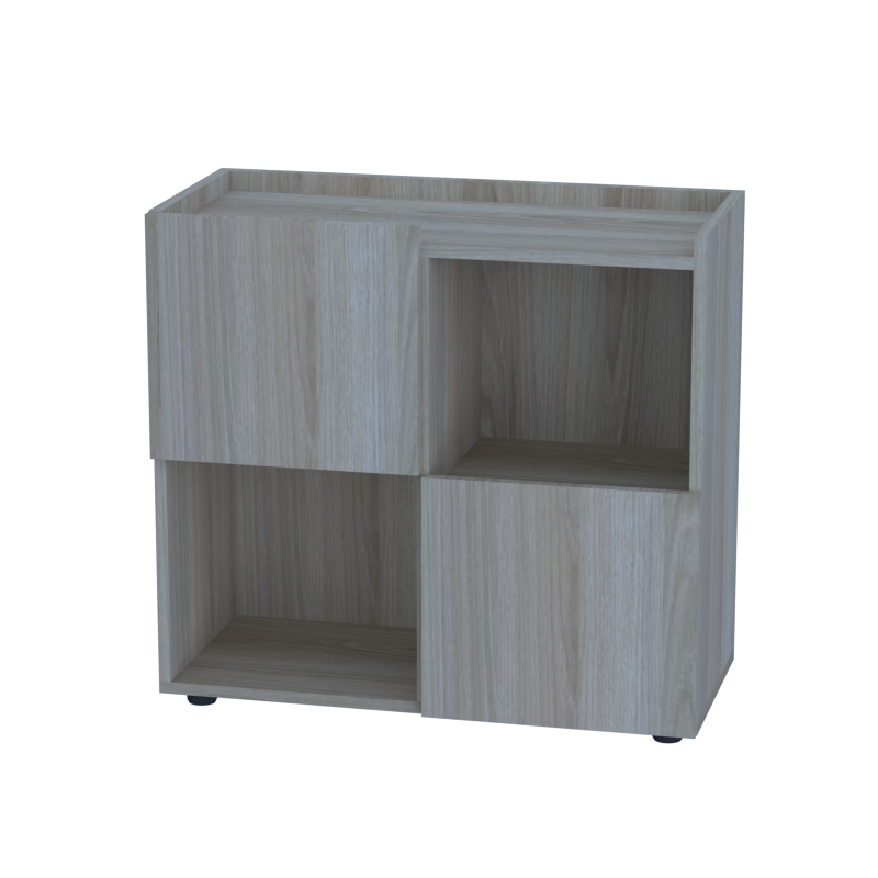 Шкаф-стеллаж с двумя открытыми и двумя закрытыми ячейками создает сбалансированное решение для офисного хранения. Закрытые секции с дверцами из ЛДСП скрывают содержимое от посторонних глаз, а открытые полки обеспечивают быстрый доступ к часто используемым предметам и дают возможность разместить небольшой декор.