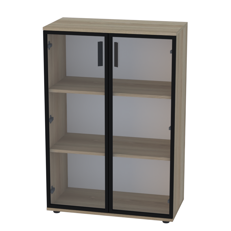 Каркас из металлического профиля обеспечивает устойчивость конструкции. Стеклянные двери в тонкой металлической раме защищают содержимое от пыли, сохраняя обзорность. Полки из ДСП 18 мм с аккуратной кромкой ПВХ 2/1 мм выдерживают значительную нагрузку.