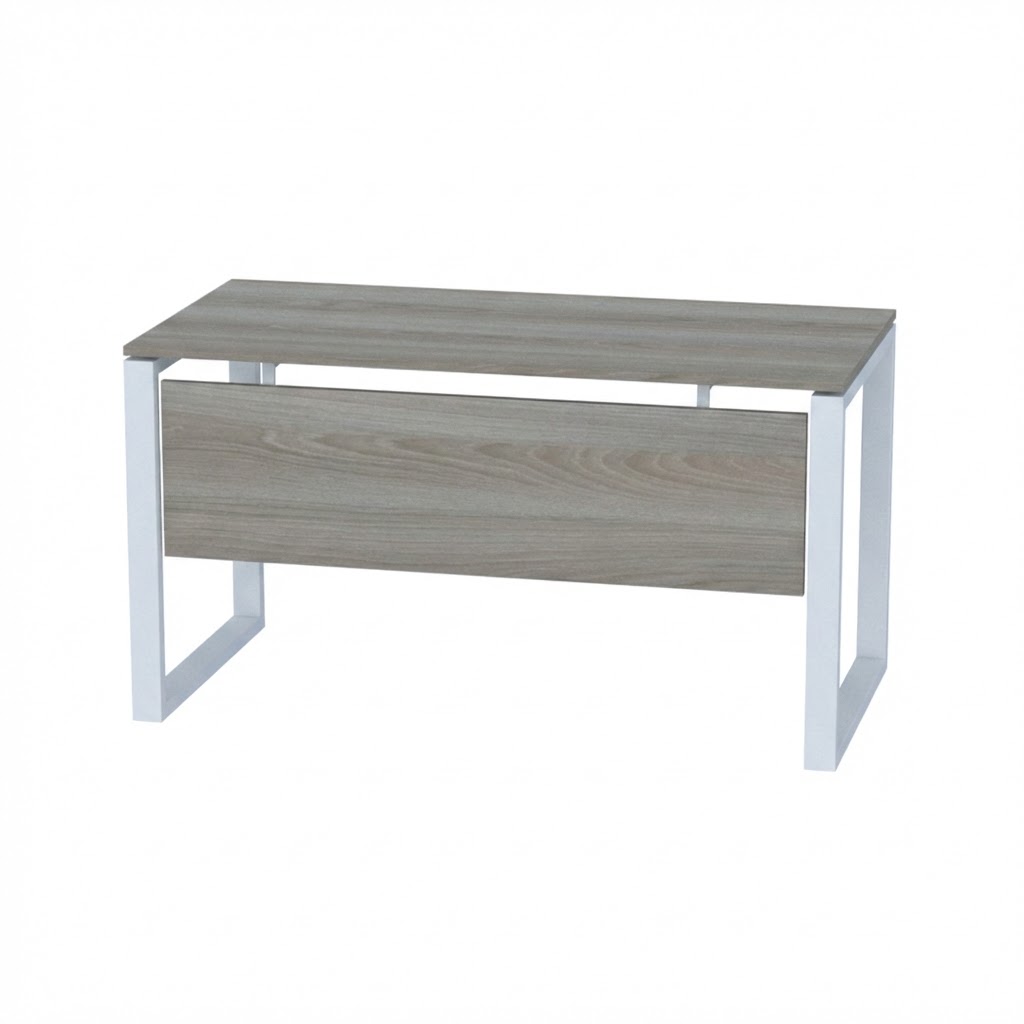 Металлические О-образные опоры обеспечивают устойчивость и долговечность конструкции, выдерживая значительные нагрузки. Защитный экран не только маскирует кабели, но и добавляет столу современный, технологичный вид. Высота 755 мм соответствует эргономичным стандартам для комфортной работы в течение всего дня.