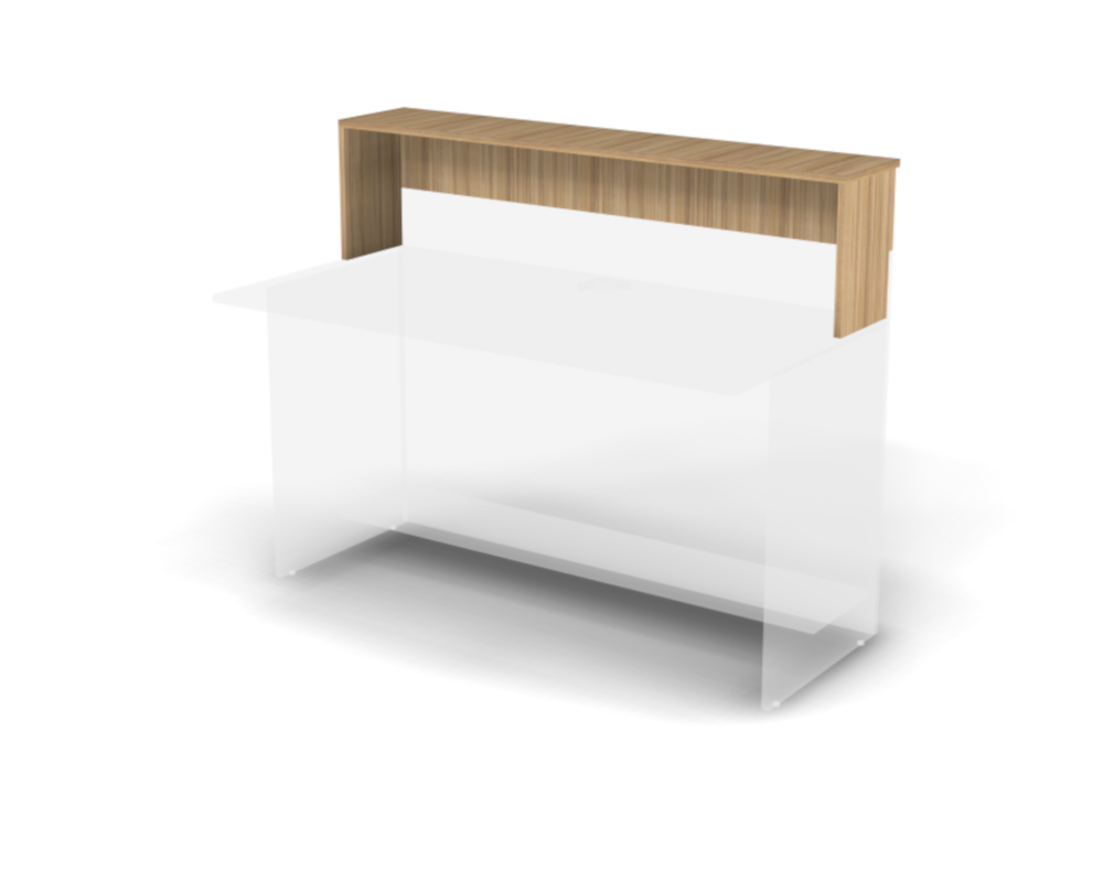 Узкая фасадная полка для дополнительной организации рабочего пространства в зоне ресепшн. Модель, дополненная боковинами, предназначена для установки на переднюю часть стола, обеспечивая дополнительное пространство для размещения документов и рабочих материалов, а она также делает стойку ресепшн выше, визуально скрывая рабочее место за ней.