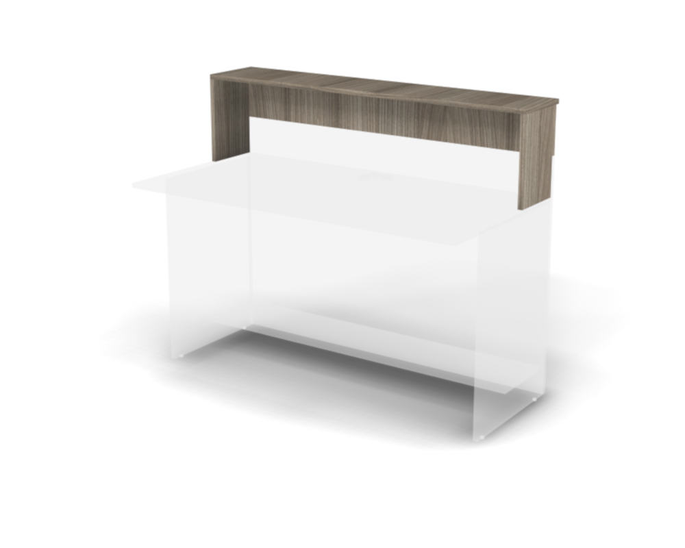 Узкая фасадная полка для дополнительной организации рабочего пространства в зоне ресепшн. Модель, дополненная боковинами, предназначена для установки на переднюю часть стола, обеспечивая дополнительное пространство для размещения документов и рабочих материалов, а она также делает стойку ресепшн выше, визуально скрывая рабочее место за ней.