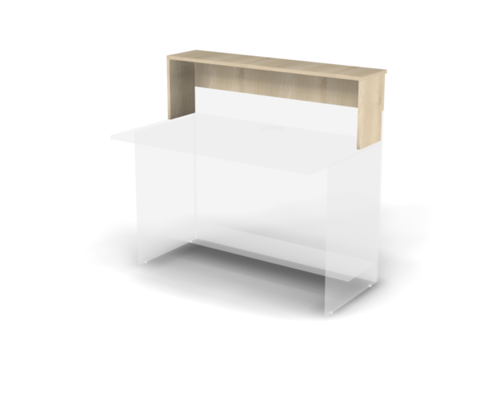 Узкая фасадная полка для дополнительной организации рабочего пространства в зоне ресепшн. Модель, дополненная боковинами, предназначена для установки на переднюю часть стола, обеспечивая дополнительное пространство для размещения документов и рабочих материалов, а она также делает стойку ресепшн выше, визуально скрывая рабочее место за ней.
