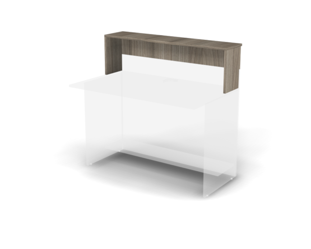 Узкая фасадная полка для дополнительной организации рабочего пространства в зоне ресепшн. Модель, дополненная боковинами, предназначена для установки на переднюю часть стола, обеспечивая дополнительное пространство для размещения документов и рабочих материалов, а она также делает стойку ресепшн выше, визуально скрывая рабочее место за ней.