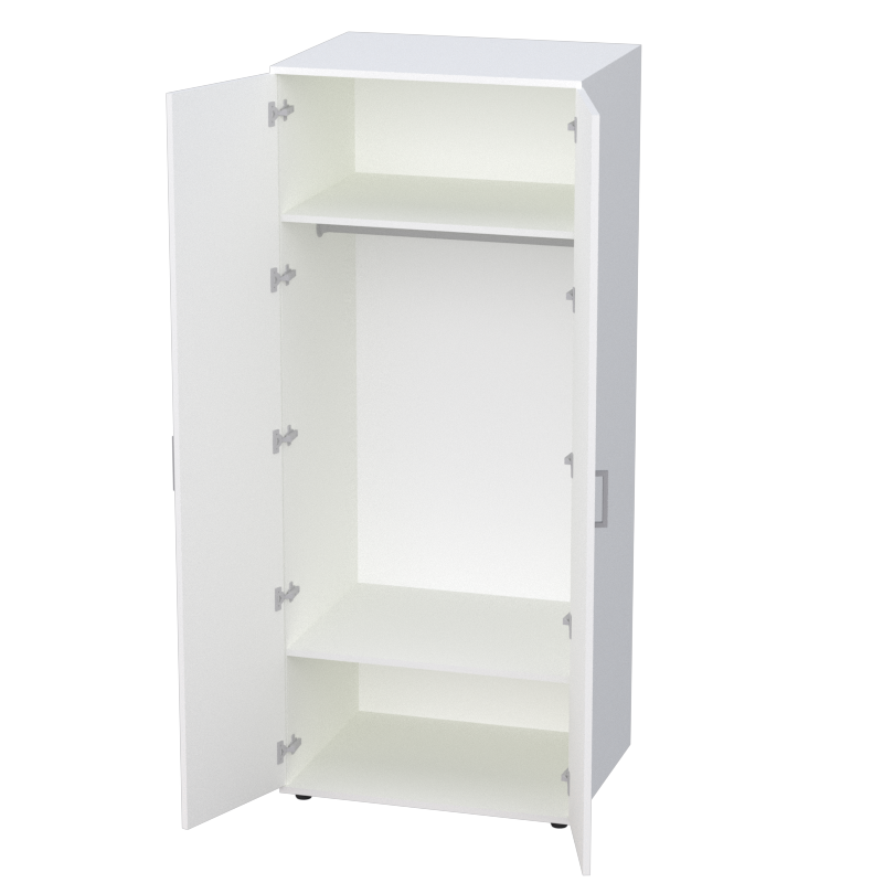 Глубокий вместительный гардероб с деревянными дверцами станет практичным решением для организации хранения в офисе. Внутреннее пространство оборудовано верхней и нижней полками, а также рейлом во всю ширину шкафа для вешалок — всё необходимое для размещения верхней одежды, униформы и личных вещей сотрудников.