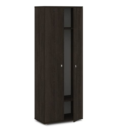 Шкаф для одежды с 2 полками, выдвижная вешалка. Верхний топ и низ выполнены из плиты толщиной 25 мм. Кромка по переднему торцу верхнего топа и низа - ПВХ 2 мм. Кромки остальных срезов - ПВХ 0,4 мм. Боковые стенки выполнены из ЛДСП толщиной 16 мм. Задняя стенка - ХДФ, состоит из 2-х частей, соединенных пластмассовой планкой. С внутренней стороны облицовка серого цвета. Две полки опорные (горизонтали) расположены на расстоянии 245 мм от верхнего и от нижнего топа. Расстояние между полками - 1575 мм. Толщина плиты - 25 мм, ширина - 786 мм, глубина - 419 мм. Штанга металлическая выдвижная устанавливается под верхней полкой, крепится к ней по центру вертикально. Дверки распашные. Фасады выполнены из ЛДСП толщиной 16 мм, крепление на 4-х петлях. Ручка – кнопка с поднимающимся язычком, размером 15 мм х 30 мм. Материал - цинковое литье, цвет - "Хром матовый". В качестве крепежной фурнитуры используются эксцентриковые стяжки, позволяющие многократно собирать и разбирать мебель без потери жесткости соединений и исключающие отверстия на лицевых поверхностях. Эксцентрики закрываются заглушками в цвет плиты. Шкаф оборудован четырьмя регулируемыми по высоте пластиковыми опорами серого цвета, диаметром 50 мм, высотой 27 мм, позволяющими компенсировать неровности пола. Регулировка ±10 мм. Материал опор - пластик серый.