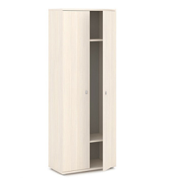 Шкаф для одежды с 2 полками, выдвижная вешалка. Верхний топ и низ выполнены из плиты толщиной 25 мм. Кромка по переднему торцу верхнего топа и низа - ПВХ 2 мм. Кромки остальных срезов - ПВХ 0,4 мм. Боковые стенки выполнены из ЛДСП толщиной 16 мм. Задняя стенка - ХДФ, состоит из 2-х частей, соединенных пластмассовой планкой. С внутренней стороны облицовка серого цвета. Две полки опорные (горизонтали) расположены на расстоянии 245 мм от верхнего и от нижнего топа. Расстояние между полками - 1575 мм. Толщина плиты - 25 мм, ширина - 786 мм, глубина - 419 мм. Штанга металлическая выдвижная устанавливается под верхней полкой, крепится к ней по центру вертикально. Дверки распашные. Фасады выполнены из ЛДСП толщиной 16 мм, крепление на 4-х петлях. Ручка – кнопка с поднимающимся язычком, размером 15 мм х 30 мм. Материал - цинковое литье, цвет - "Хром матовый". В качестве крепежной фурнитуры используются эксцентриковые стяжки, позволяющие многократно собирать и разбирать мебель без потери жесткости соединений и исключающие отверстия на лицевых поверхностях. Эксцентрики закрываются заглушками в цвет плиты. Шкаф оборудован четырьмя регулируемыми по высоте пластиковыми опорами серого цвета, диаметром 50 мм, высотой 27 мм, позволяющими компенсировать неровности пола. Регулировка ±10 мм. Материал опор - пластик серый.