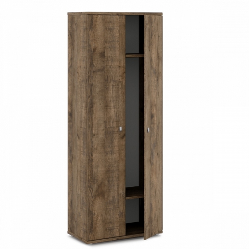 Шкаф для одежды с 2 полками, выдвижная вешалка. Верхний топ и низ выполнены из плиты толщиной 25 мм. Кромка по переднему торцу верхнего топа и низа - ПВХ 2 мм. Кромки остальных срезов - ПВХ 0,4 мм. Боковые стенки выполнены из ЛДСП толщиной 16 мм. Задняя стенка - ХДФ, состоит из 2-х частей, соединенных пластмассовой планкой. С внутренней стороны облицовка серого цвета. Две полки опорные (горизонтали) расположены на расстоянии 245 мм от верхнего и от нижнего топа. Расстояние между полками - 1575 мм. Толщина плиты - 25 мм, ширина - 786 мм, глубина - 419 мм. Штанга металлическая выдвижная устанавливается под верхней полкой, крепится к ней по центру вертикально. Дверки распашные. Фасады выполнены из ЛДСП толщиной 16 мм, крепление на 4-х петлях. Ручка – кнопка с поднимающимся язычком, размером 15 мм х 30 мм. Материал - цинковое литье, цвет - "Хром матовый". В качестве крепежной фурнитуры используются эксцентриковые стяжки, позволяющие многократно собирать и разбирать мебель без потери жесткости соединений и исключающие отверстия на лицевых поверхностях. Эксцентрики закрываются заглушками в цвет плиты. Шкаф оборудован четырьмя регулируемыми по высоте пластиковыми опорами серого цвета, диаметром 50 мм, высотой 27 мм, позволяющими компенсировать неровности пола. Регулировка ±10 мм. Материал опор - пластик серый.