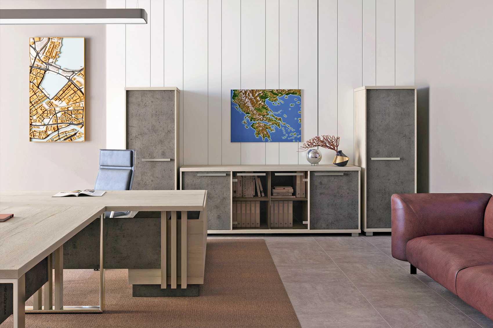 Дверь и задняя стенка - ЛДСП толщиной 18 мм в цвете "Бетон". Дверь вкладные. Заглублены относительно верха шкафа на 19 мм.