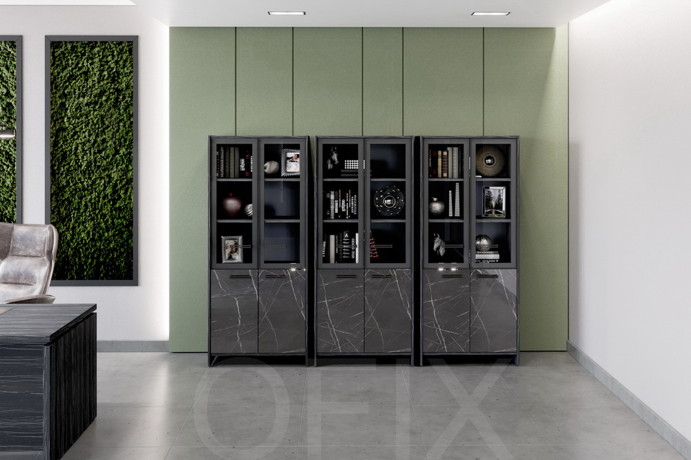 Двери стеклянные, распашные, средние. Фасады в черном алюминиевом профиле. Стекло серое тонированное толщиной 4 мм.