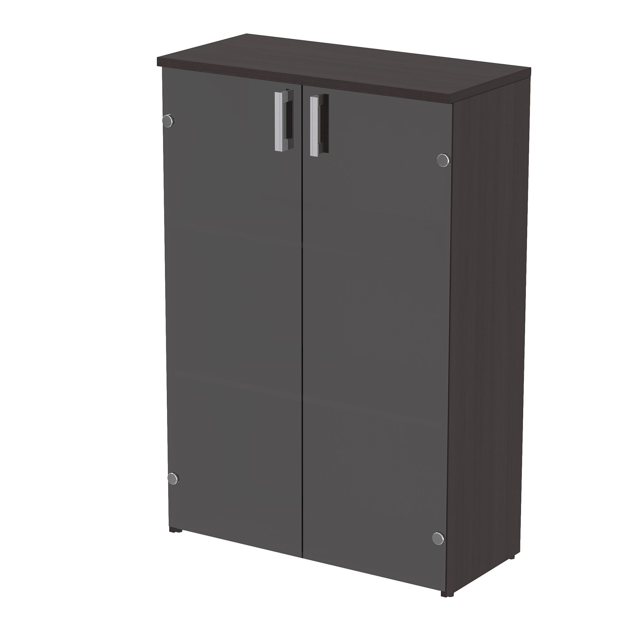 Стеклянные фасады с металлической фурнитурой создают современный эстетичный вид, гармонично сочетаясь с корпусом из качественного ЛДСП. Конструкция идеально подходит для хранения образцов, каталогов или материалов, требующих быстрого поиска и демонстрации.