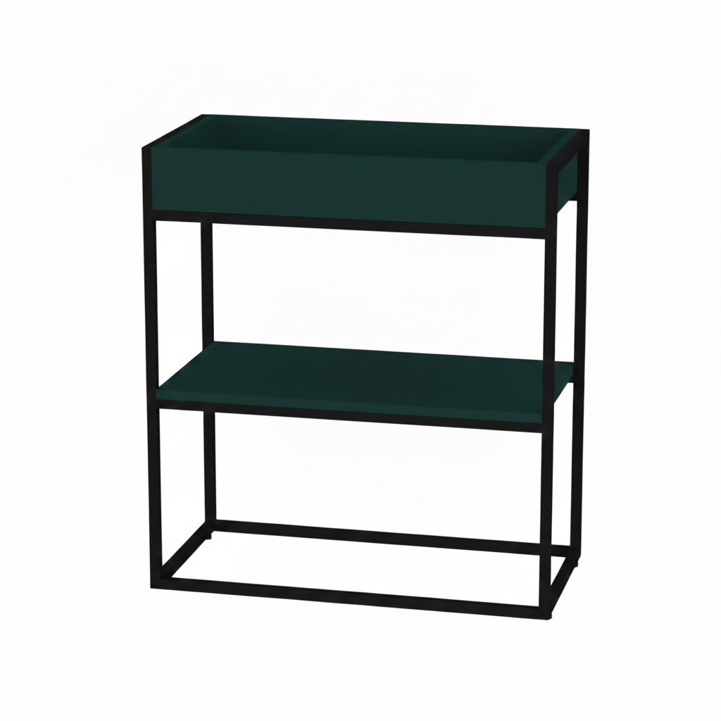 Металлический каркас обеспечивает прочность и устойчивость конструкции. Полки и кашпо выполнены из ЛДСП, что гарантирует единство стиля и долговечность. Растения в верхней части не только украшают интерьер, но и способствуют созданию комфортной рабочей атмосферы.