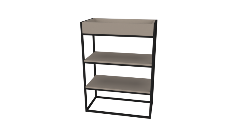 Высокий стеллаж-кашпо сочетает функциональность хранения с элементами озеленения офисного пространства. В нижней части расположены две обычные полки для документов или рабочих материалов, а вверху — встроенный ящик-кашпо для живых растений.