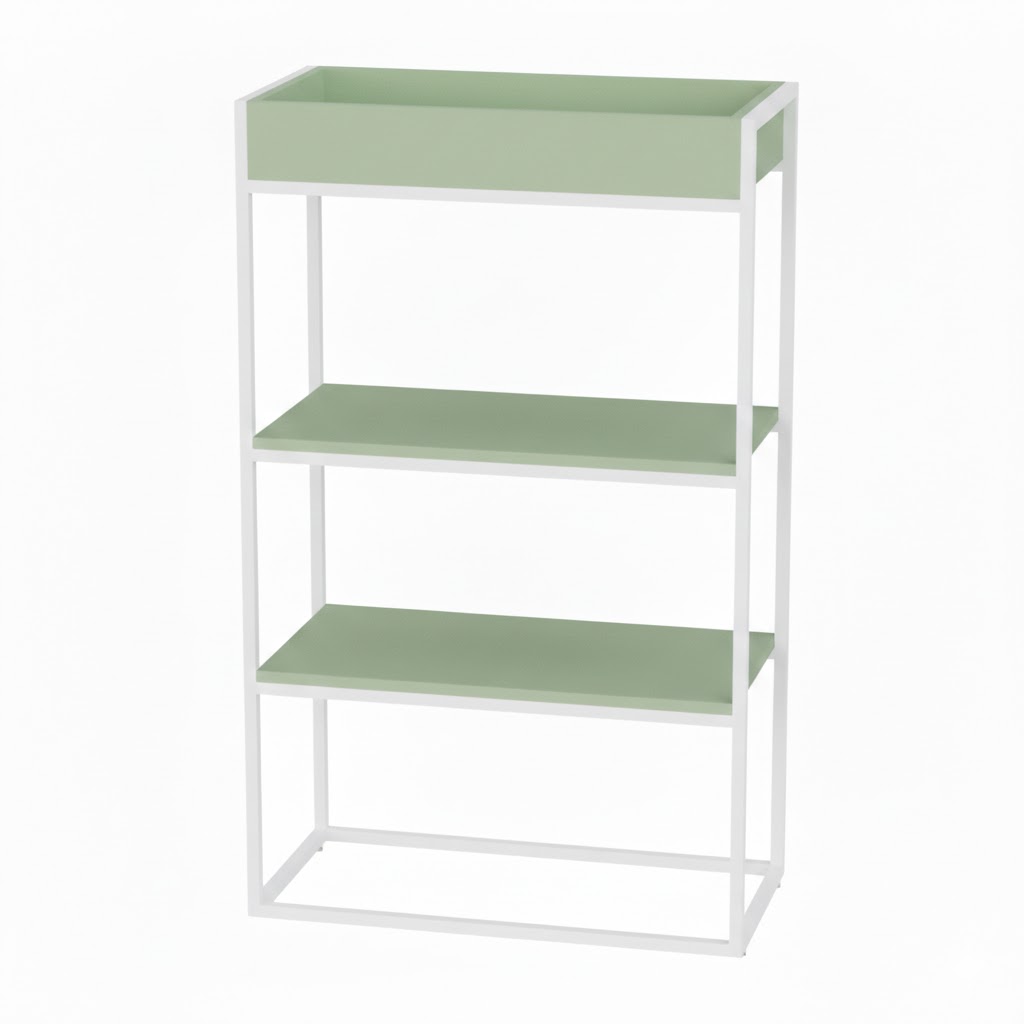 Высокий стеллаж-кашпо сочетает функциональность хранения с элементами озеленения офисного пространства. В нижней части расположены две обычные полки для документов или рабочих материалов, а вверху — встроенный ящик-кашпо для живых растений.