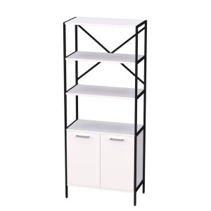 Высокий стеллаж с металлическим каркасом и дополнительными крестообразными креплениями по задней стенке создает надежную систему хранения для офиса. В нижней части расположен закрытый шкафчик с деревянными дверцами для защиты содержимого, а вверху — три открытые полки для легкого доступа к документам и материалам.