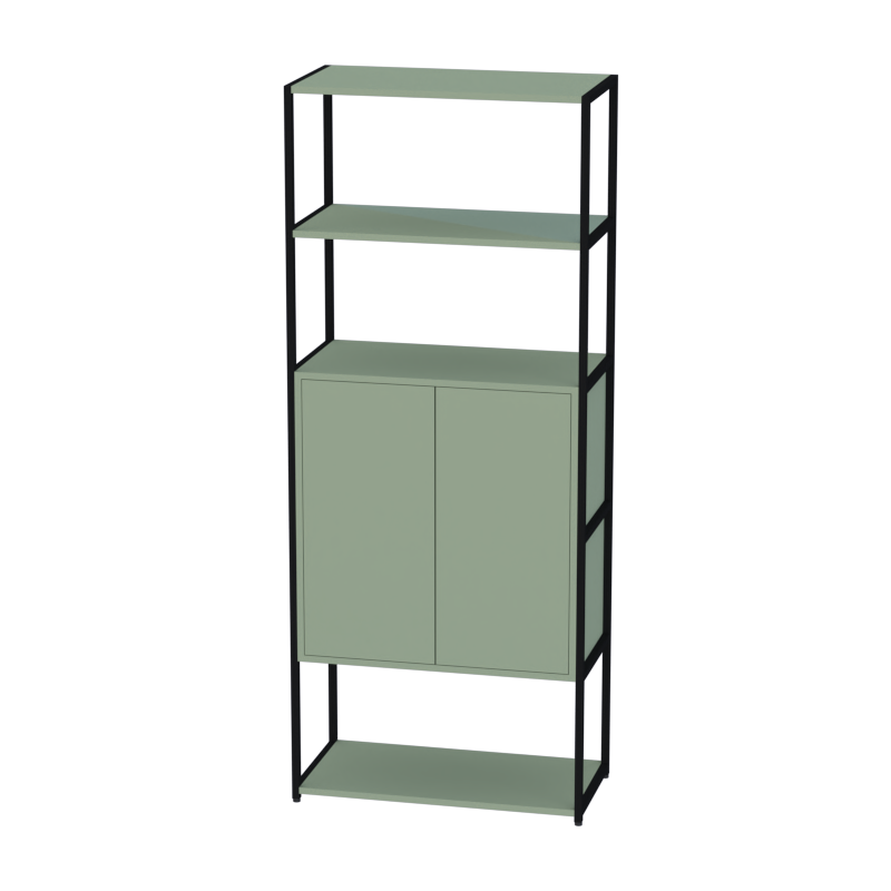 Стеллаж металлический высокий с фасадами и системой открытия нажатием создает современное и организованное решение для хранения в офисе. Верхняя часть с двумя открытыми полками обеспечивает легкий доступ к часто используемым материалам, а центральный шкаф со скрытым механизмом открывания надежно хранит документы и ценные предметы.