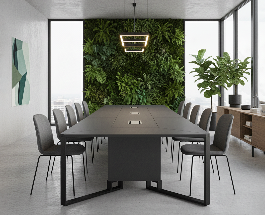 Стол Event отличается продуманной функциональностью: под столешницей организовано специальное пространство для кабелей и розеток, что позволяет легко подключить все необходимое оборудование, сохраняя рабочую поверхность чистой и организованной. Это решение поддерживает аккуратный вид зоны переговоров и соответствует высоким требованиям современного бизнес-пространства.